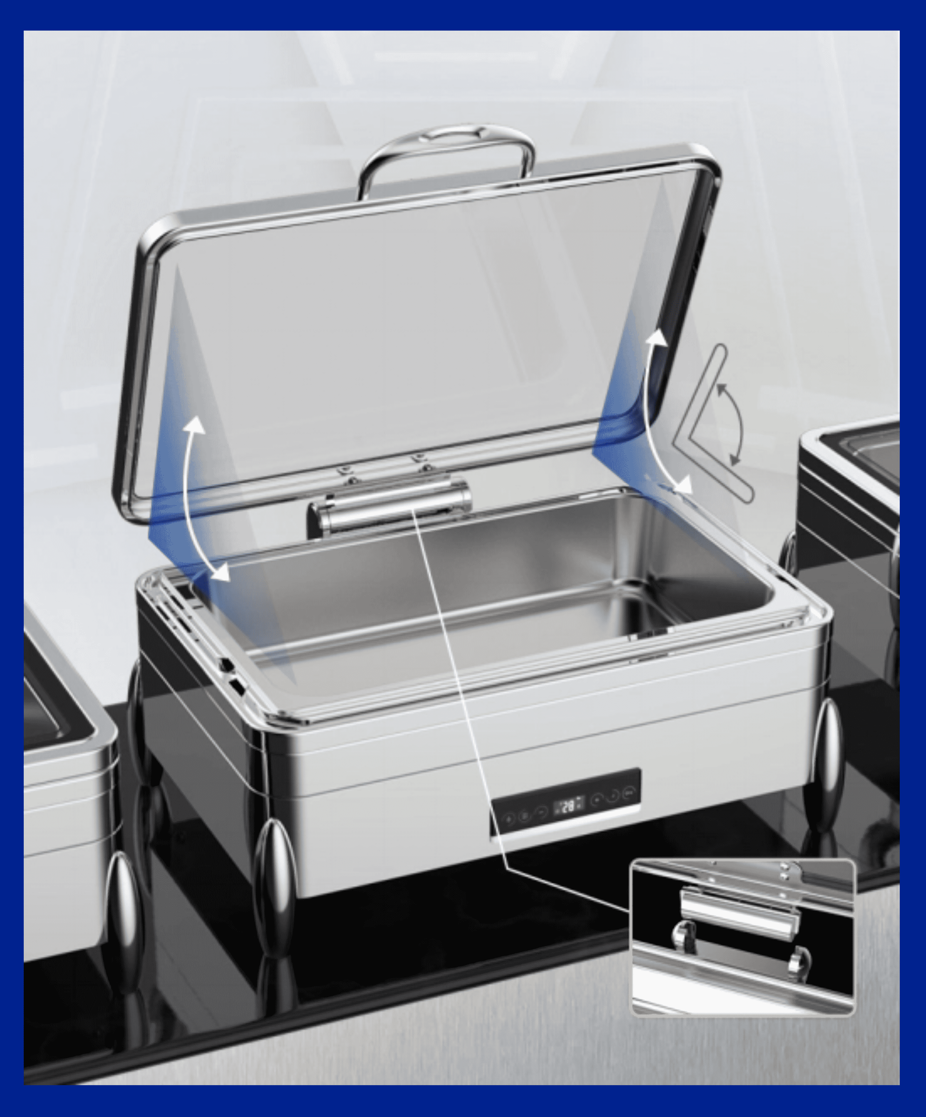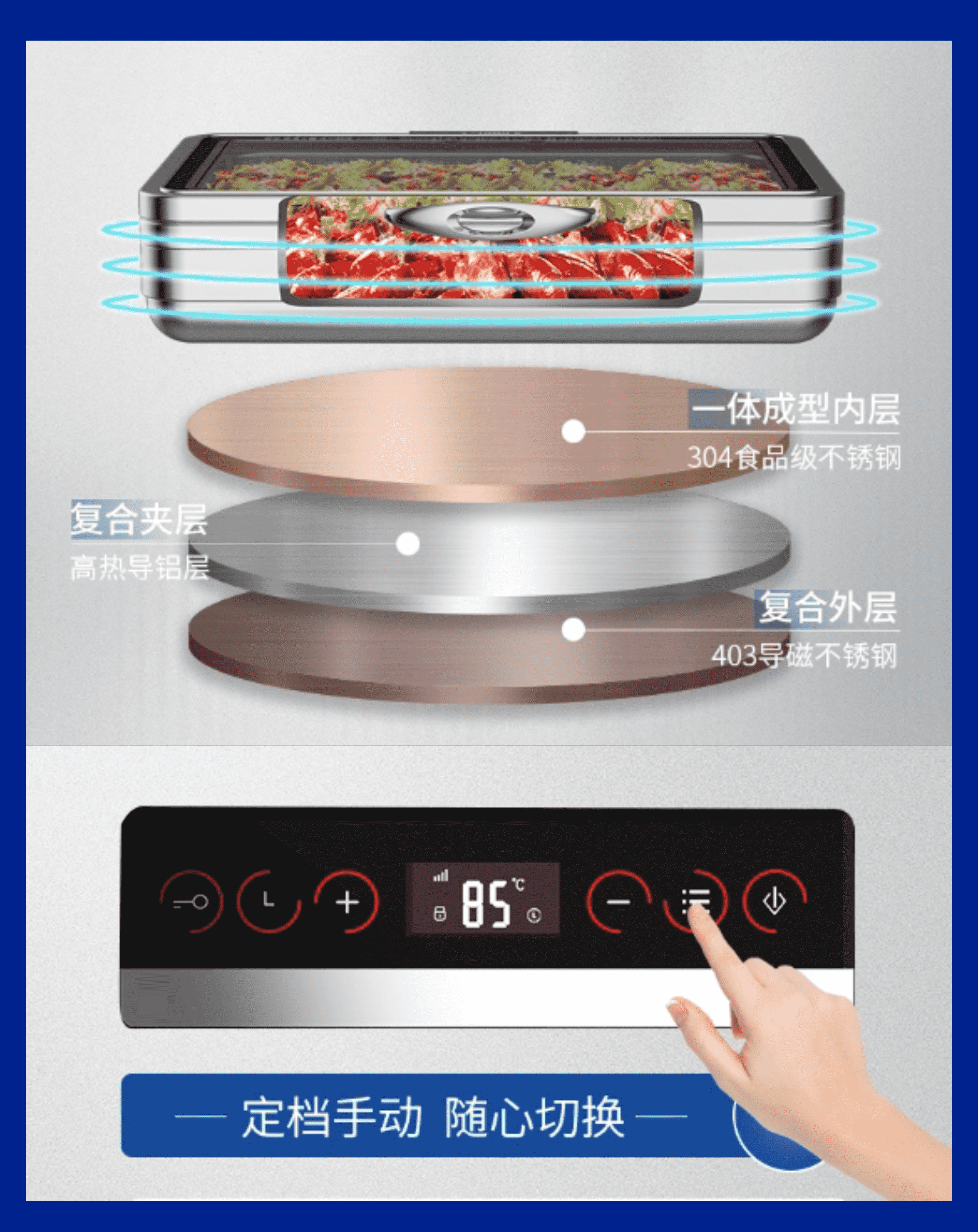 底部采用3层复合底结构,导热迅速,受热均匀,有效避免局部过热导致的食物品质下降。高档OLED显示屏支持触控操作,直观易用,即使初次使用也能轻松上手。自研第六代液压阻尼轴确保全程静音开合,经过8万次测试仍保持顺滑如初,完美适配高端餐饮场所对静谧环境的需求。