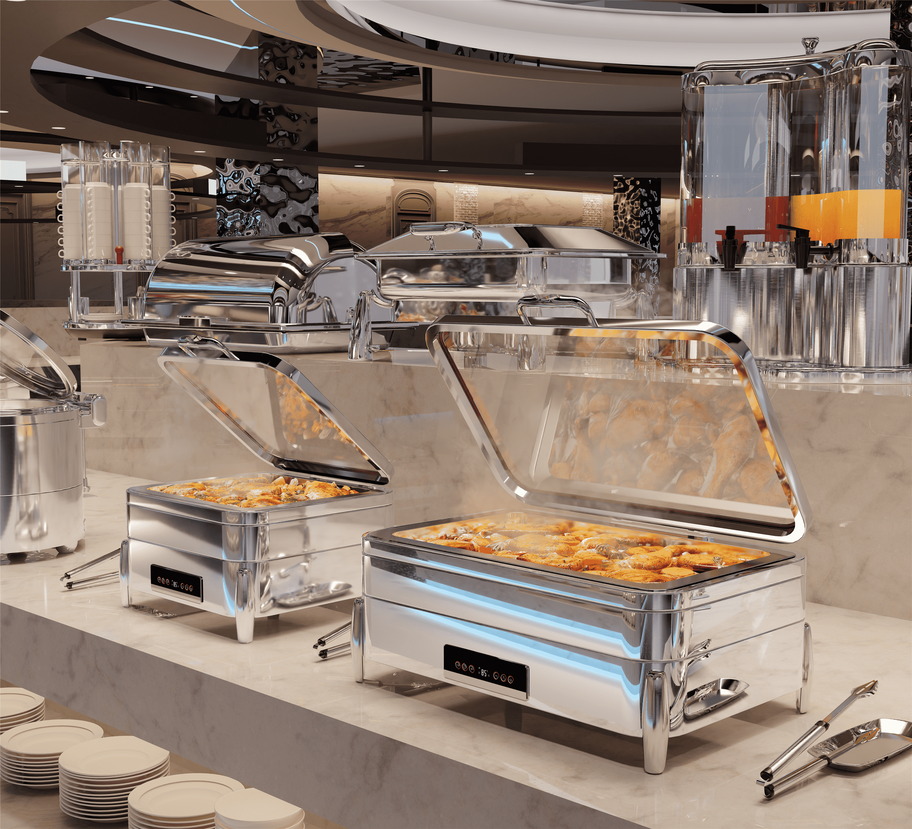 :专注旋转式自助餐炉,提升用餐体验与餐台互动性。其360°静音旋转设计能吸引顾客,适配特色主题餐厅。