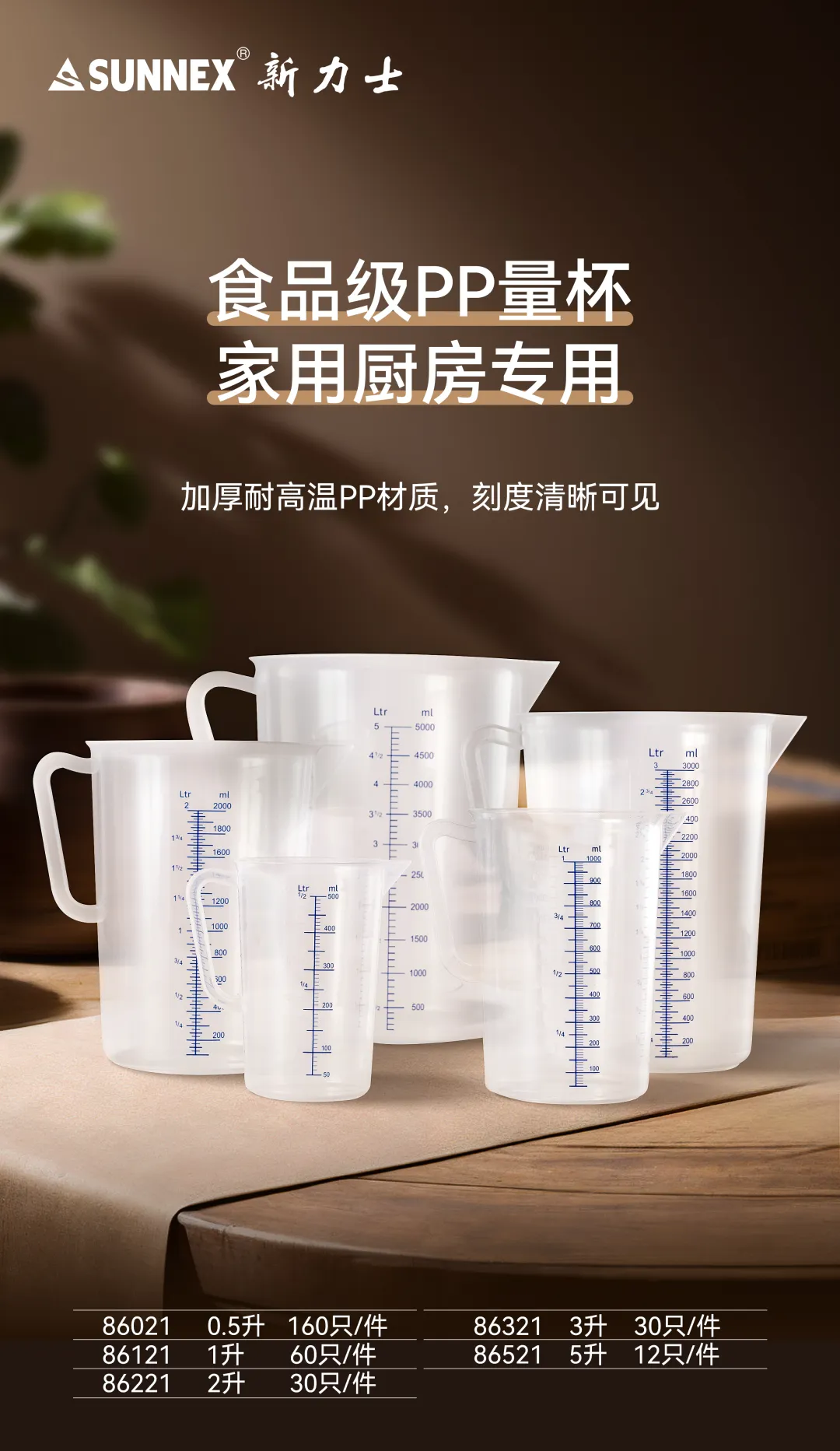 新力士生产的PP量杯采用优质食品级聚丙烯材料制成,安全无毒,适合家庭和专业厨房使用。量杯的透明设计让您可以清晰地看到内部液体的量,杯体上刻有清晰的刻度,便于精准测量各种液体和粉末状食材。PP量杯具备良好的耐热性和耐化学性,适用于微波炉和洗碗机清洗,使用方便。其轻巧的设计和人体工学手柄,使操作更加舒适,是厨房中不可或缺的实用工具,满足您对精确烹饪的需求。