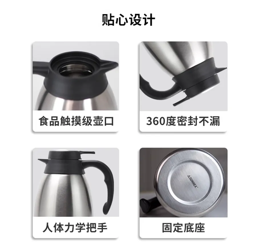SUNNEX不锈钢真空保温壶采用食品级不锈钢材质,物理性能稳定,高温受热不会释放有毒物质,保证日常使用的安全性。 SUNNEX不锈钢真空保温壶360°全密封不漏水;一键按压,轻松出水,有效避免热水喷溅伤及人体,健康饮水,全因有你。