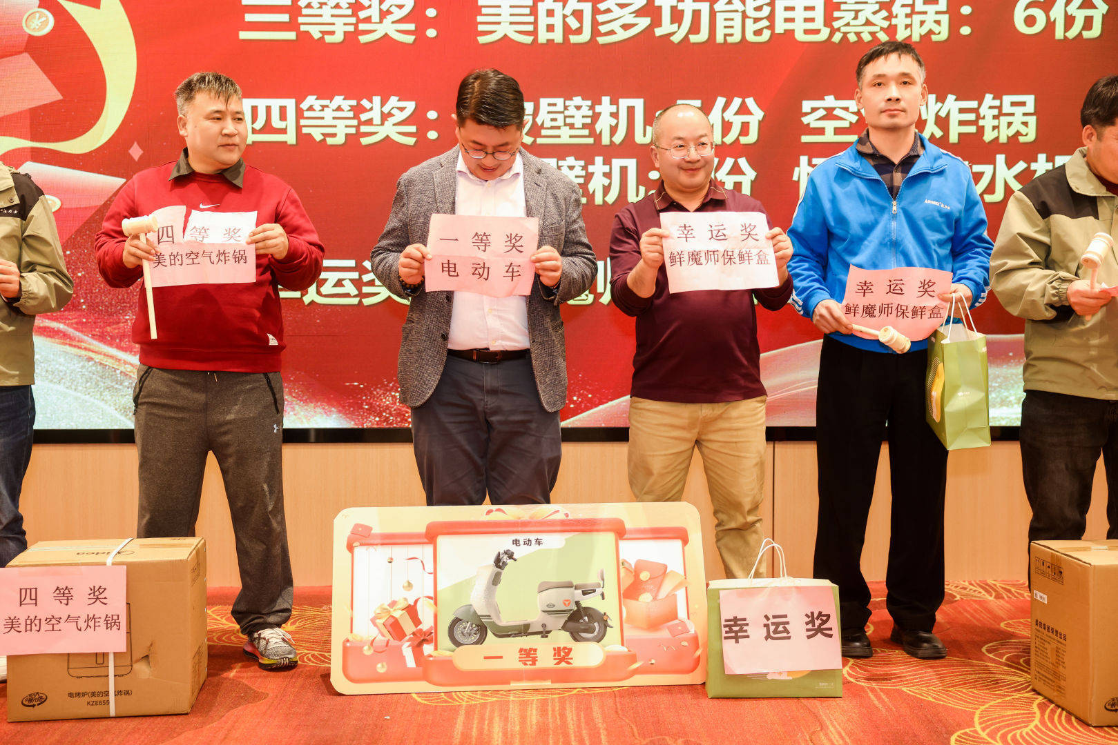 抽奖环节高潮迭起,百年总经理卜育民先生、管理委员会副主席朱海军先生、日升实业销售经理周伟钊先生、百年副总经理李小乐、财务中心总监盛学涛先生、总经办主任张改红女士、电子商务中心总监段宗海先生、营销中心代理总监王雪女士、日升实业行政经理方美珍女士等领导相继登台担任抽奖嘉宾,十轮抽奖共诞生 88 位幸运儿。每一轮挥锤都牵动全场目光,揭晓奖项的瞬间,欢呼声此起彼伏,中奖家人们笑意盈盈的模样,成为当晚最动人的风景线。丰厚的奖品与独特的互动形式,点燃了一波又一波热烈气氛。
