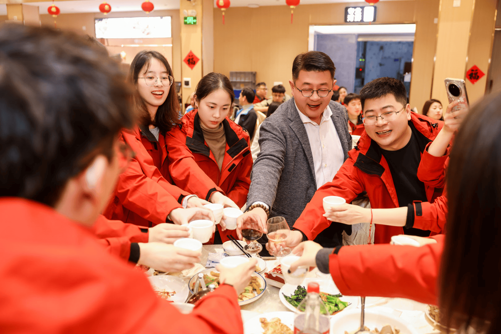 现场暖意升级,余总携高管登台祝酒,杯盏相碰间,敬过往耕耘,敬今朝相聚,敬未来可期。“聚力前行,共绘新章”的祝酒声回荡全场,大家的心紧紧相依,将领导与员工、企业与伙伴的情谊,融进这满席佳肴与醇厚酒香之中。